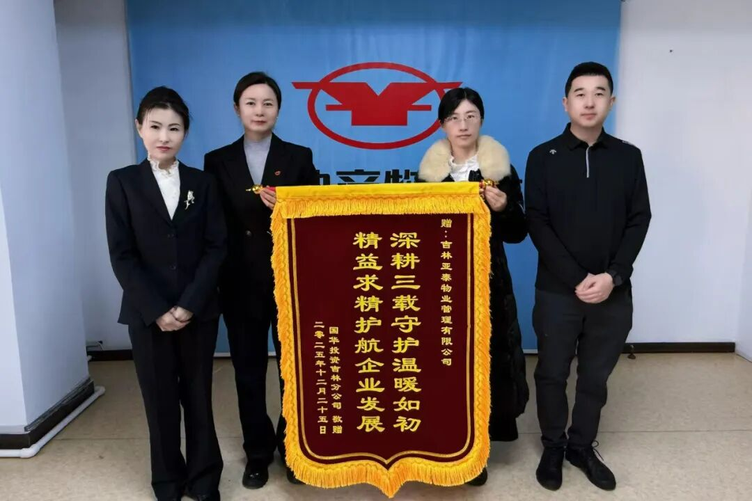 岁暮天寒,心意愈暖。2025年12月25日,亚泰物业总公司迎来温馨一幕——甲方国华投资吉林分公司专程送来一面饱含认可与谢意的锦旗,锦旗上“深耕三载守护温暖如初,精益求精护航企业发展”十六个大字,字字千钧,既是对双方三年携手同行的深情回望,更是对亚泰物业服务品质的高度肯定。